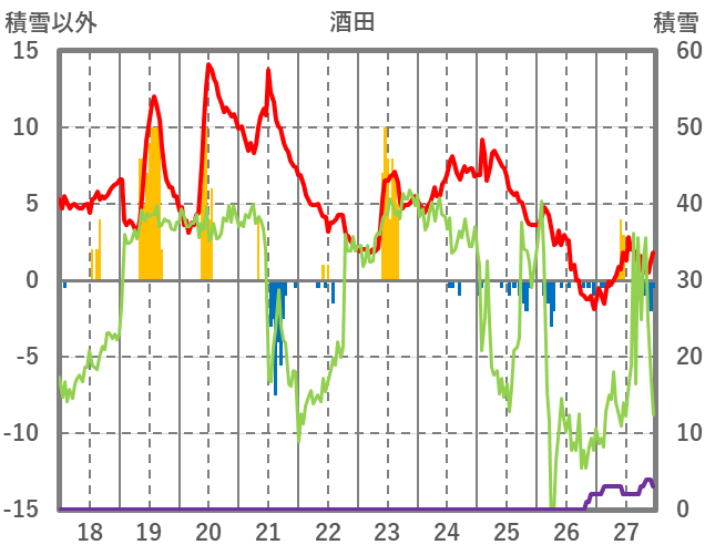 | 日 | 時 | 気温 | 降水 | 風向/風速 | 日照 | 積雪 | 降雪 |