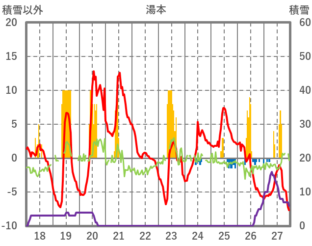| 日 | 時 | 気温 | 降水 | 風向/風速 | 日照 | 積雪 | 降雪 |