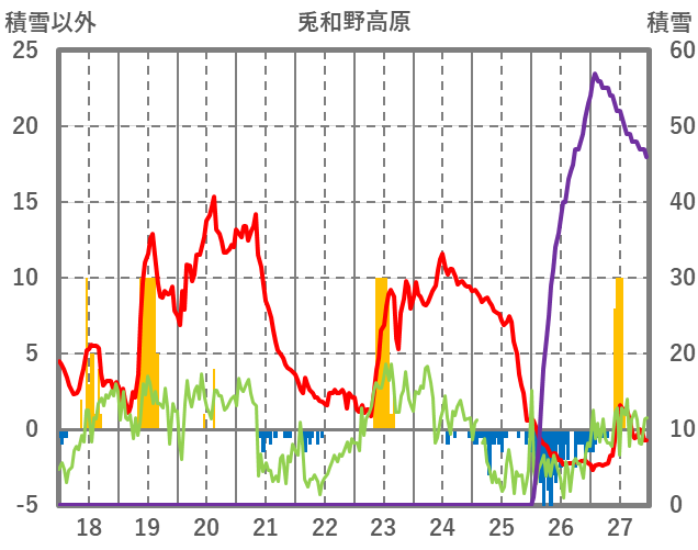 | 日 | 時 | 気温 | 降水 | 風向/風速 | 日照 | 積雪 | 降雪 |
