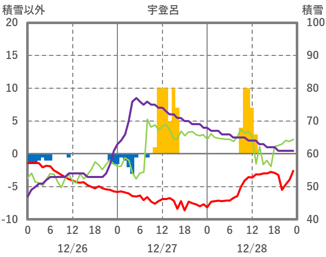 | 日 | 時 | 気温 | 降水 | 風向/風速 | 日照 | 積雪 | 降雪 |