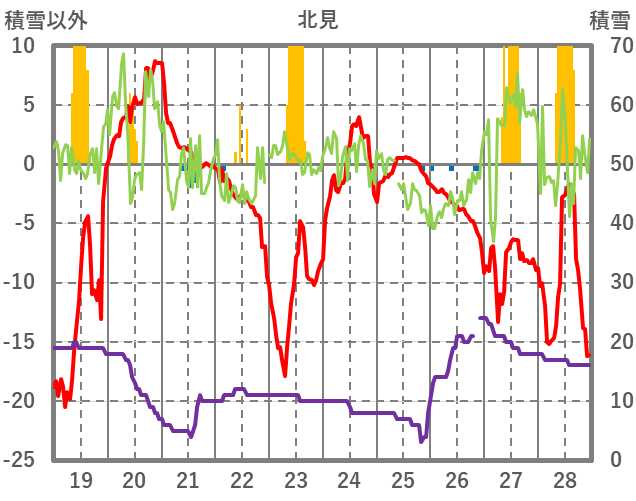 | 日 | 時 | 気温 | 降水 | 風向/風速 | 日照 | 積雪 | 降雪 |
