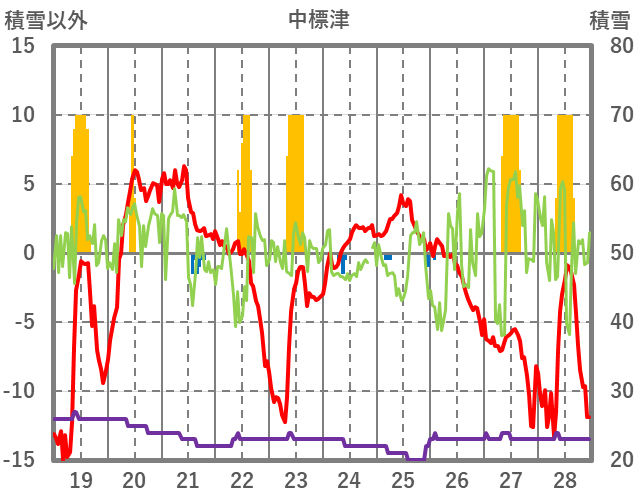 | 日 | 時 | 気温 | 降水 | 風向/風速 | 日照 | 積雪 | 降雪 |