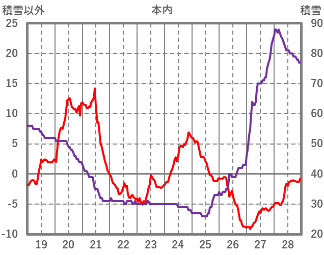 | 日 | 時 | 気温 | 降水 | 風向/風速 | 日照 | 積雪 | 降雪 |
