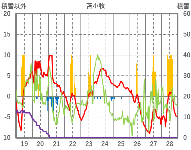 | 日 | 時 | 気温 | 降水 | 風向/風速 | 日照 | 積雪 | 降雪 |