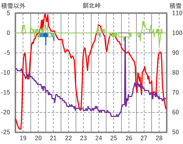 | 日 | 時 | 気温 | 降水 | 風向/風速 | 日照 | 積雪 | 降雪 |