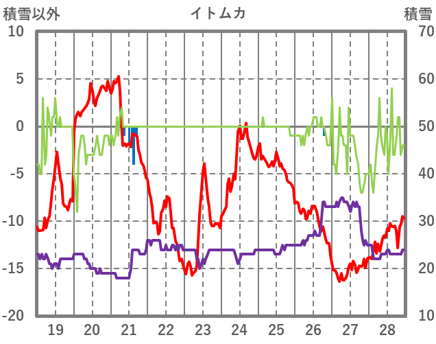 | 日 | 時 | 気温 | 降水 | 風向/風速 | 日照 | 積雪 | 降雪 |