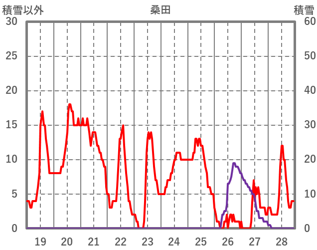 | 日 | 時 | 気温 | 降水 | 風向/風速 | 日照 | 積雪 | 降雪 |