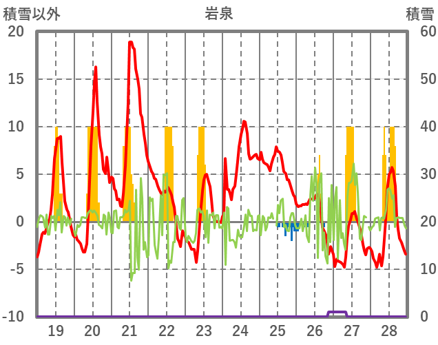 | 日 | 時 | 気温 | 降水 | 風向/風速 | 日照 | 積雪 | 降雪 |