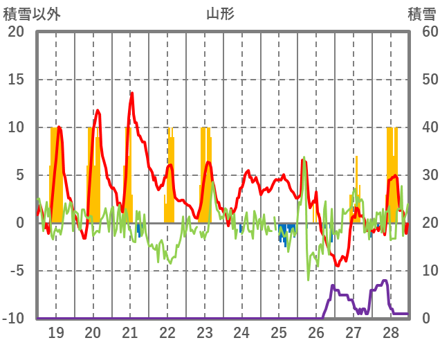 | 日 | 時 | 気温 | 降水 | 風向/風速 | 日照 | 積雪 | 降雪 |