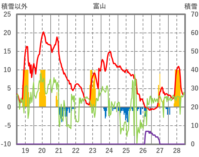 | 日 | 時 | 気温 | 降水 | 風向/風速 | 日照 | 積雪 | 降雪 |