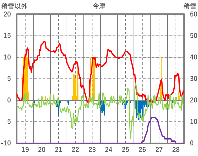 | 日 | 時 | 気温 | 降水 | 風向/風速 | 日照 | 積雪 | 降雪 |
