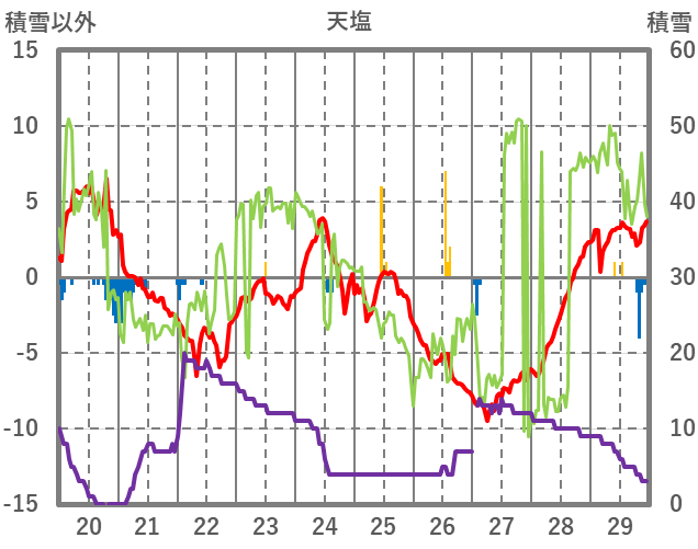 | 日 | 時 | 気温 | 降水 | 風向/風速 | 日照 | 積雪 | 降雪 |