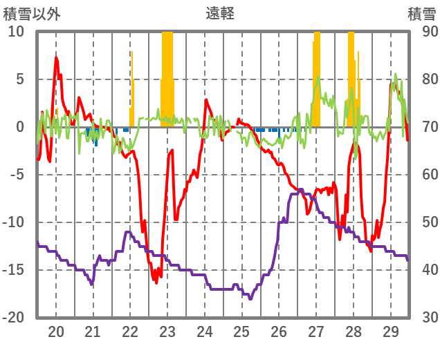 | 日 | 時 | 気温 | 降水 | 風向/風速 | 日照 | 積雪 | 降雪 |