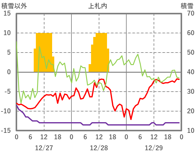 | 日 | 時 | 気温 | 降水 | 風向/風速 | 日照 | 積雪 | 降雪 |