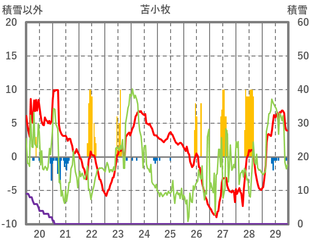 | 日 | 時 | 気温 | 降水 | 風向/風速 | 日照 | 積雪 | 降雪 |