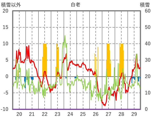 | 日 | 時 | 気温 | 降水 | 風向/風速 | 日照 | 積雪 | 降雪 |
