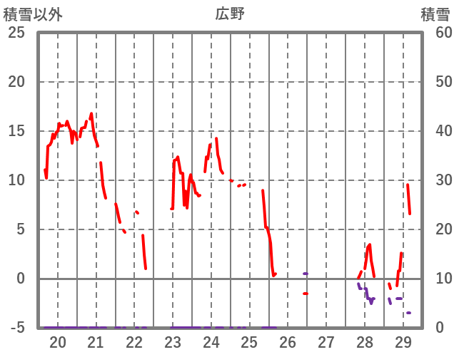| 日 | 時 | 気温 | 降水 | 風向/風速 | 日照 | 積雪 | 降雪 |