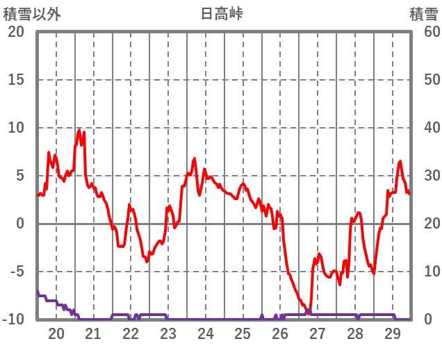 | 日 | 時 | 気温 | 降水 | 風向/風速 | 日照 | 積雪 | 降雪 |