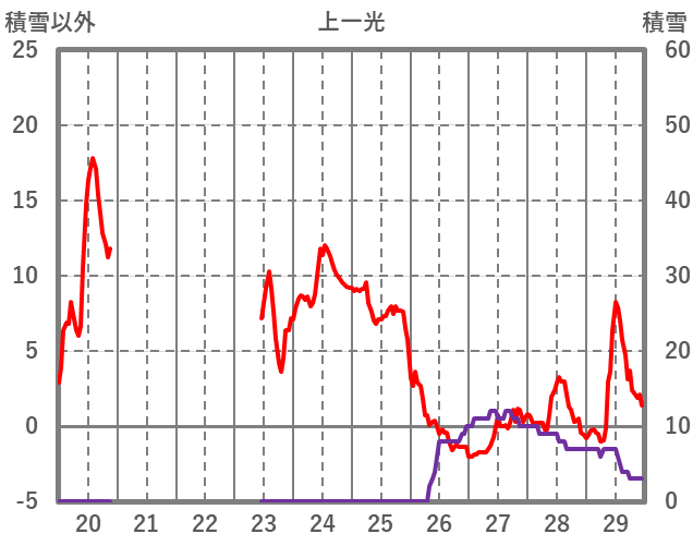 | 日 | 時 | 気温 | 降水 | 風向/風速 | 日照 | 積雪 | 降雪 |