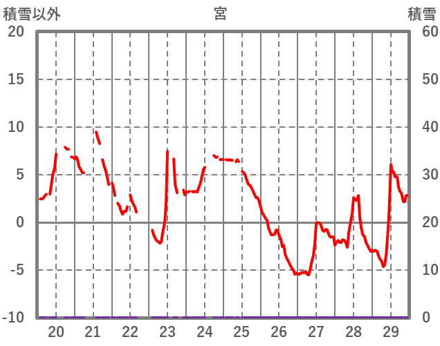 | 日 | 時 | 気温 | 降水 | 風向/風速 | 日照 | 積雪 | 降雪 |