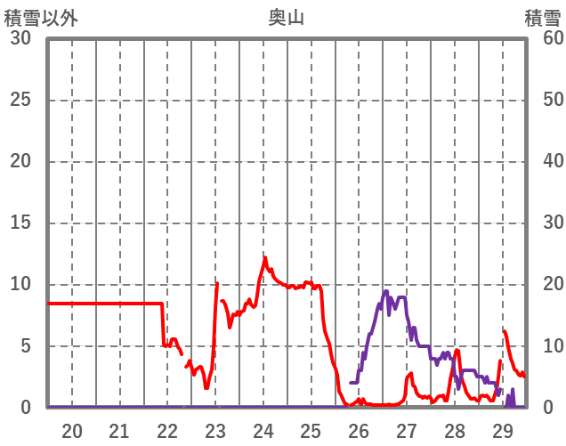 | 日 | 時 | 気温 | 降水 | 風向/風速 | 日照 | 積雪 | 降雪 |