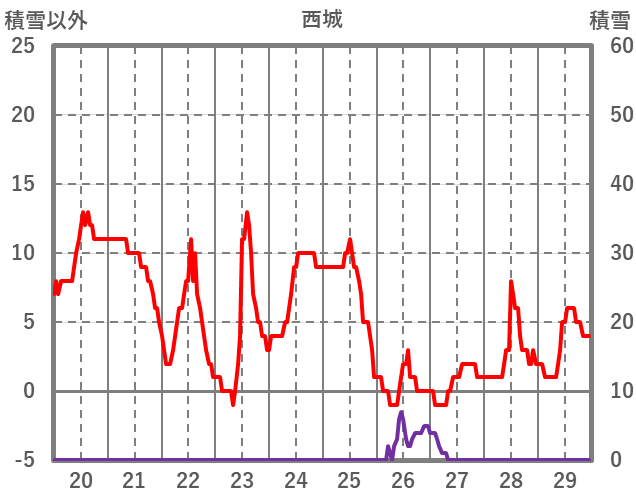 | 日 | 時 | 気温 | 降水 | 風向/風速 | 日照 | 積雪 | 降雪 |