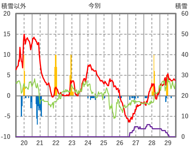 | 日 | 時 | 気温 | 降水 | 風向/風速 | 日照 | 積雪 | 降雪 |
