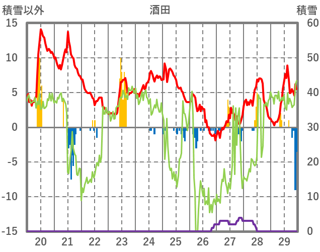 | 日 | 時 | 気温 | 降水 | 風向/風速 | 日照 | 積雪 | 降雪 |