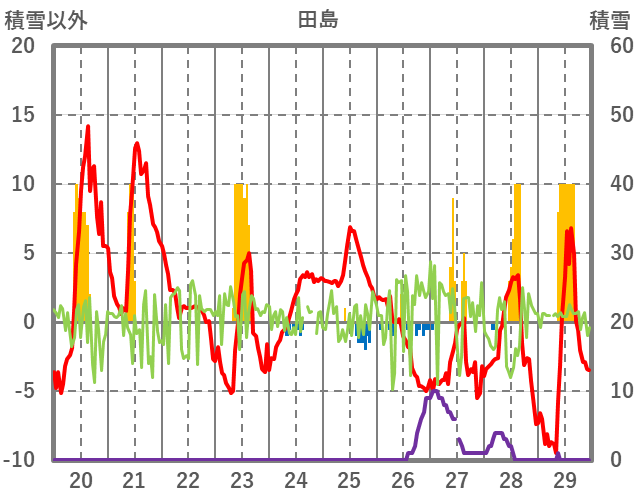 | 日 | 時 | 気温 | 降水 | 風向/風速 | 日照 | 積雪 | 降雪 |
