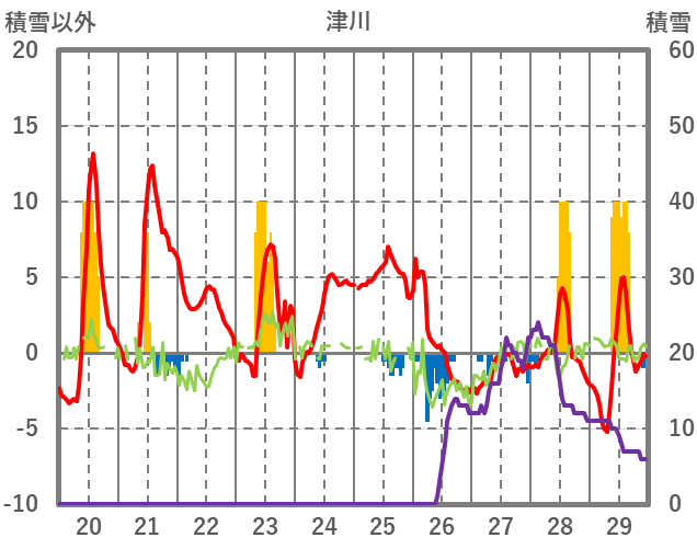 | 日 | 時 | 気温 | 降水 | 風向/風速 | 日照 | 積雪 | 降雪 |