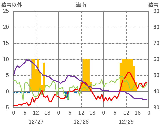 | 日 | 時 | 気温 | 降水 | 風向/風速 | 日照 | 積雪 | 降雪 |