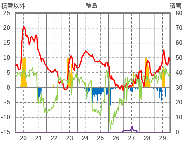 | 日 | 時 | 気温 | 降水 | 風向/風速 | 日照 | 積雪 | 降雪 |