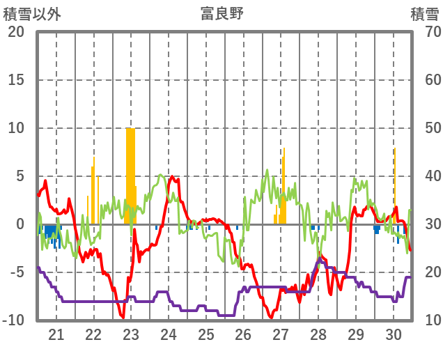 | 日 | 時 | 気温 | 降水 | 風向/風速 | 日照 | 積雪 | 降雪 |