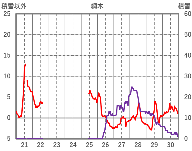 | 日 | 時 | 気温 | 降水 | 風向/風速 | 日照 | 積雪 | 降雪 |