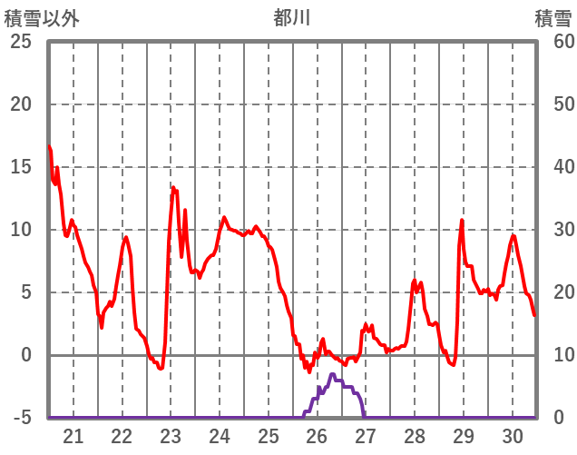 | 日 | 時 | 気温 | 降水 | 風向/風速 | 日照 | 積雪 | 降雪 |