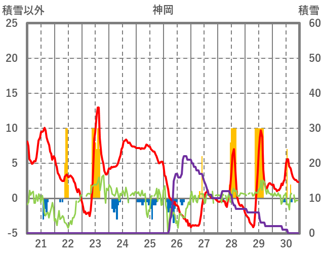 | 日 | 時 | 気温 | 降水 | 風向/風速 | 日照 | 積雪 | 降雪 |