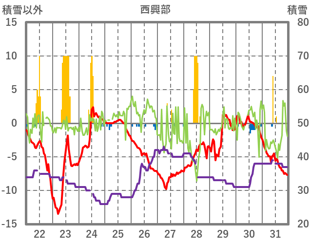 | 日 | 時 | 気温 | 降水 | 風向/風速 | 日照 | 積雪 | 降雪 |