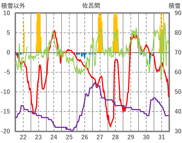 | 日 | 時 | 気温 | 降水 | 風向/風速 | 日照 | 積雪 | 降雪 |