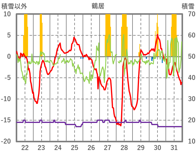 | 日 | 時 | 気温 | 降水 | 風向/風速 | 日照 | 積雪 | 降雪 |