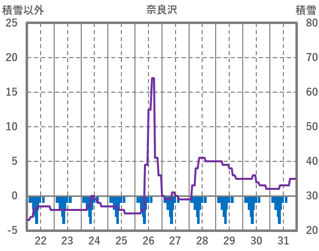 | 日 | 時 | 気温 | 降水 | 風向/風速 | 日照 | 積雪 | 降雪 |