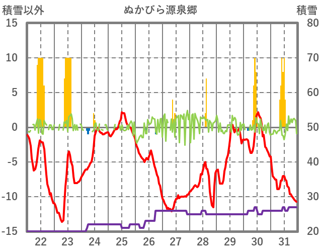 | 日 | 時 | 気温 | 降水 | 風向/風速 | 日照 | 積雪 | 降雪 |