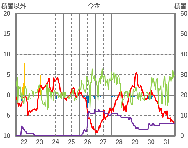 | 日 | 時 | 気温 | 降水 | 風向/風速 | 日照 | 積雪 | 降雪 |