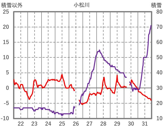 | 日 | 時 | 気温 | 降水 | 風向/風速 | 日照 | 積雪 | 降雪 |