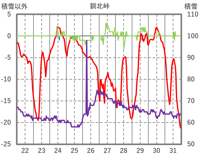 | 日 | 時 | 気温 | 降水 | 風向/風速 | 日照 | 積雪 | 降雪 |
