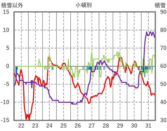 | 日 | 時 | 気温 | 降水 | 風向/風速 | 日照 | 積雪 | 降雪 |