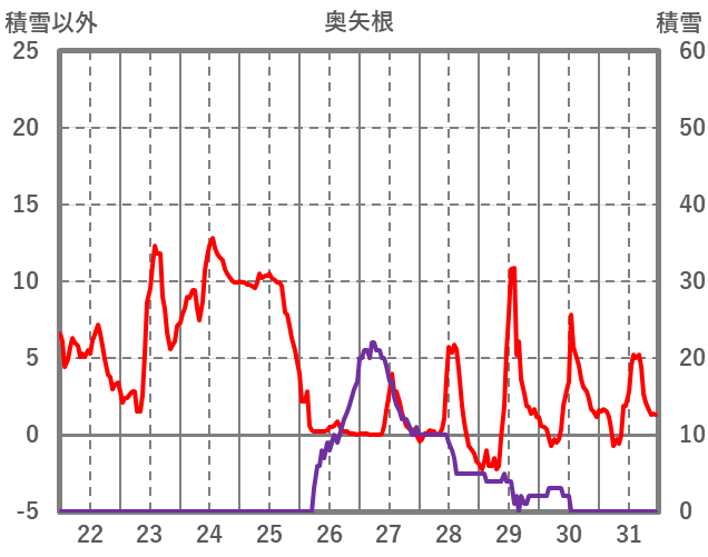 | 日 | 時 | 気温 | 降水 | 風向/風速 | 日照 | 積雪 | 降雪 |