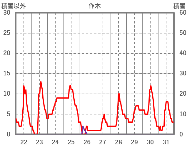 | 日 | 時 | 気温 | 降水 | 風向/風速 | 日照 | 積雪 | 降雪 |