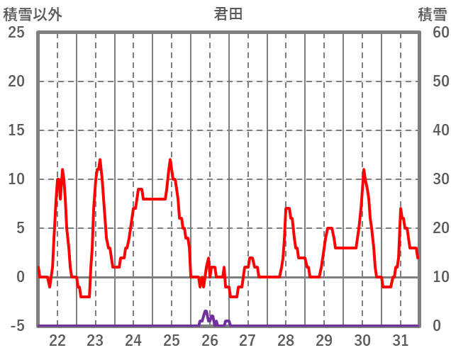 | 日 | 時 | 気温 | 降水 | 風向/風速 | 日照 | 積雪 | 降雪 |