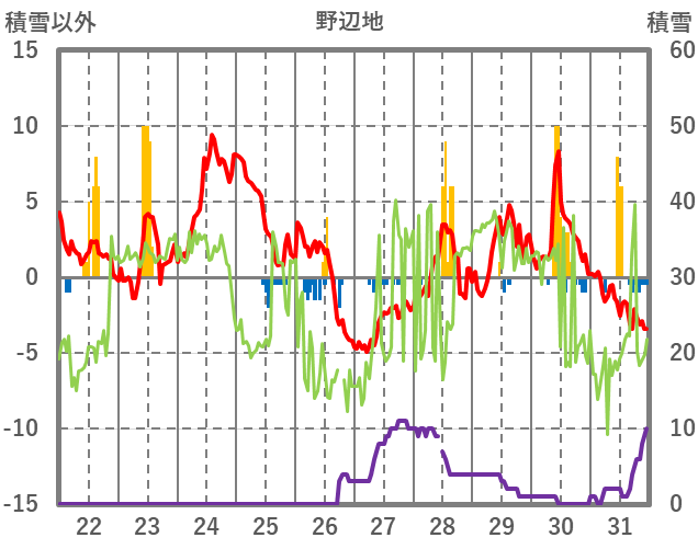 | 日 | 時 | 気温 | 降水 | 風向/風速 | 日照 | 積雪 | 降雪 |