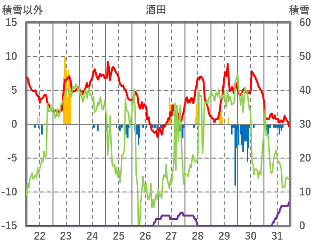 | 日 | 時 | 気温 | 降水 | 風向/風速 | 日照 | 積雪 | 降雪 |